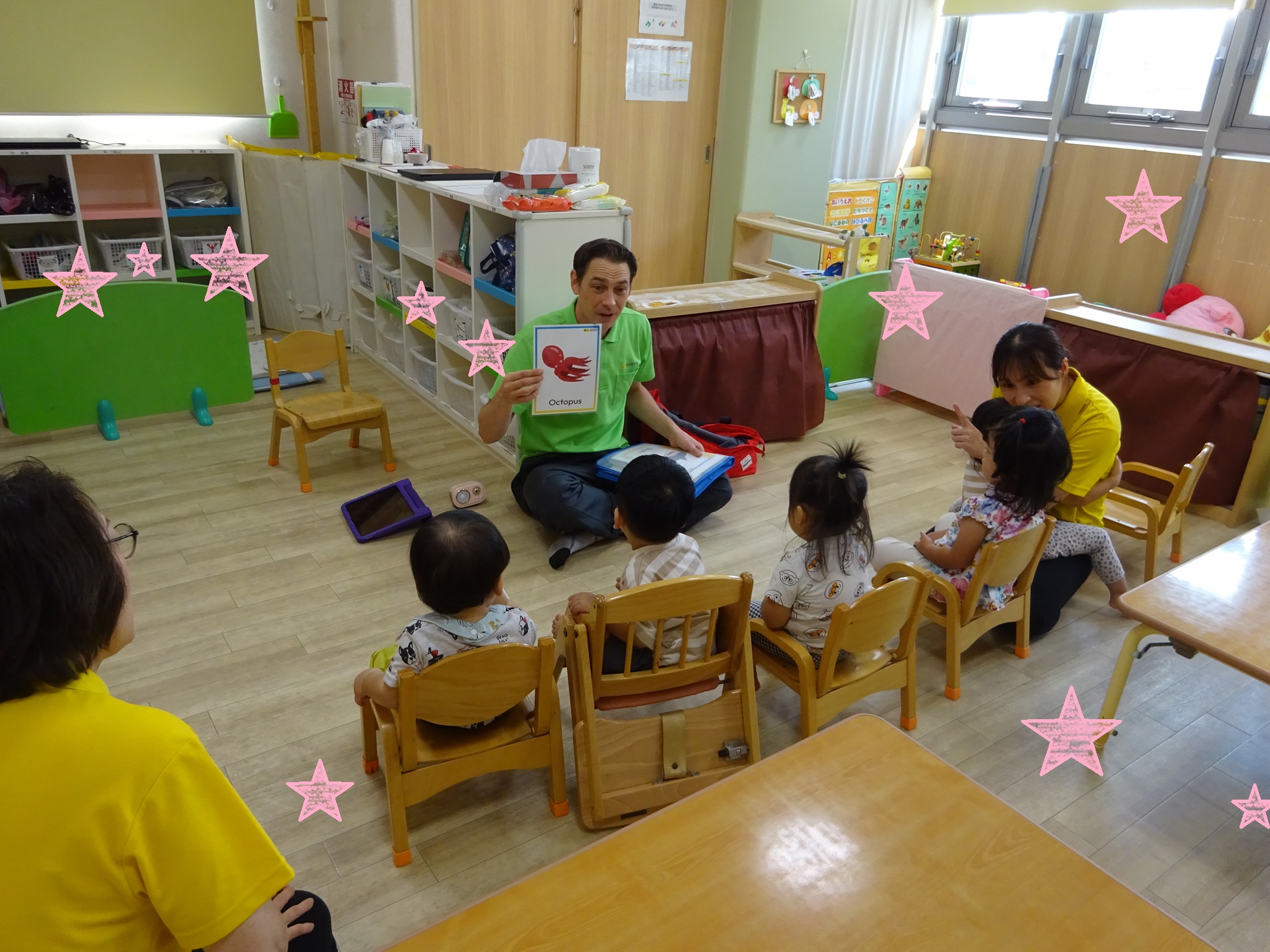 0歳児1歳児さんも色や海の生き物など今月のテーマに沿った内容でレッスンに参加しています✨