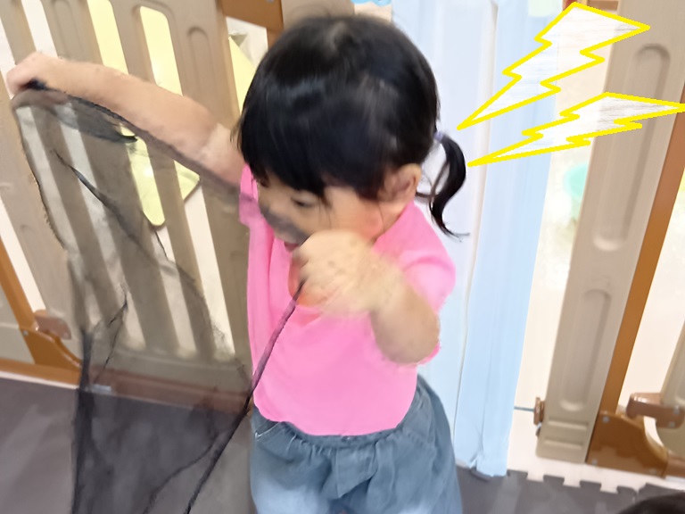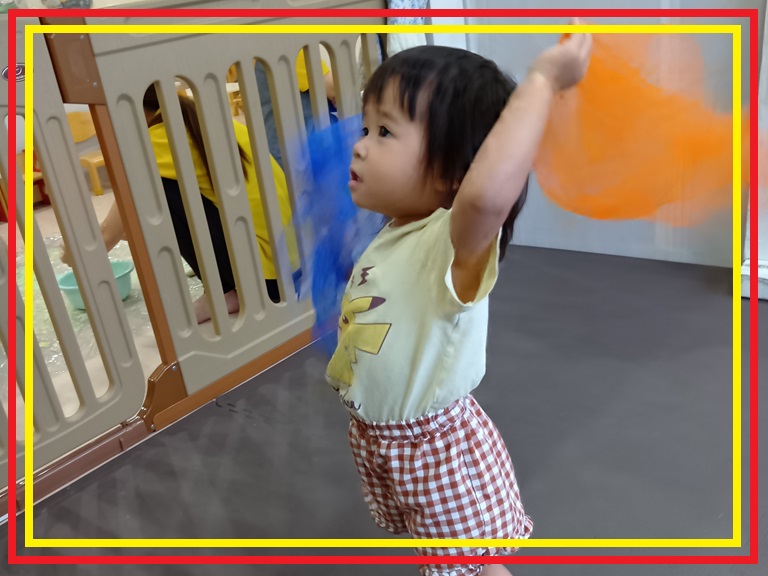 キャッチした布をじっと見つめ「みどり!!」「あお」と、嬉しそうに見せてくれます☺️