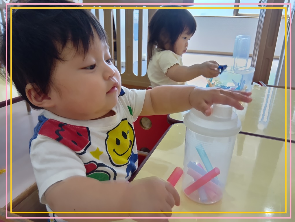 指の動かし方のコツが分かってきたので、細いストローを1本ずつポトンと落とせるようになってきましたよ💕