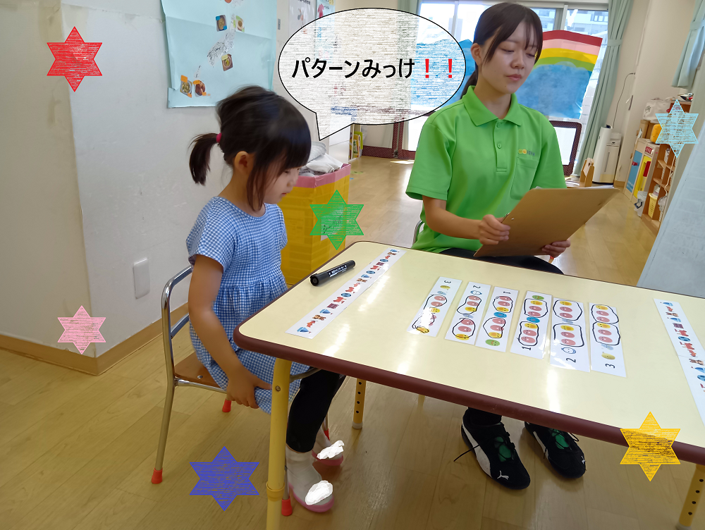 4歳児では、様々なパターンを探したり、子ども同士で話し合ったりしながら答えを導きだしています。