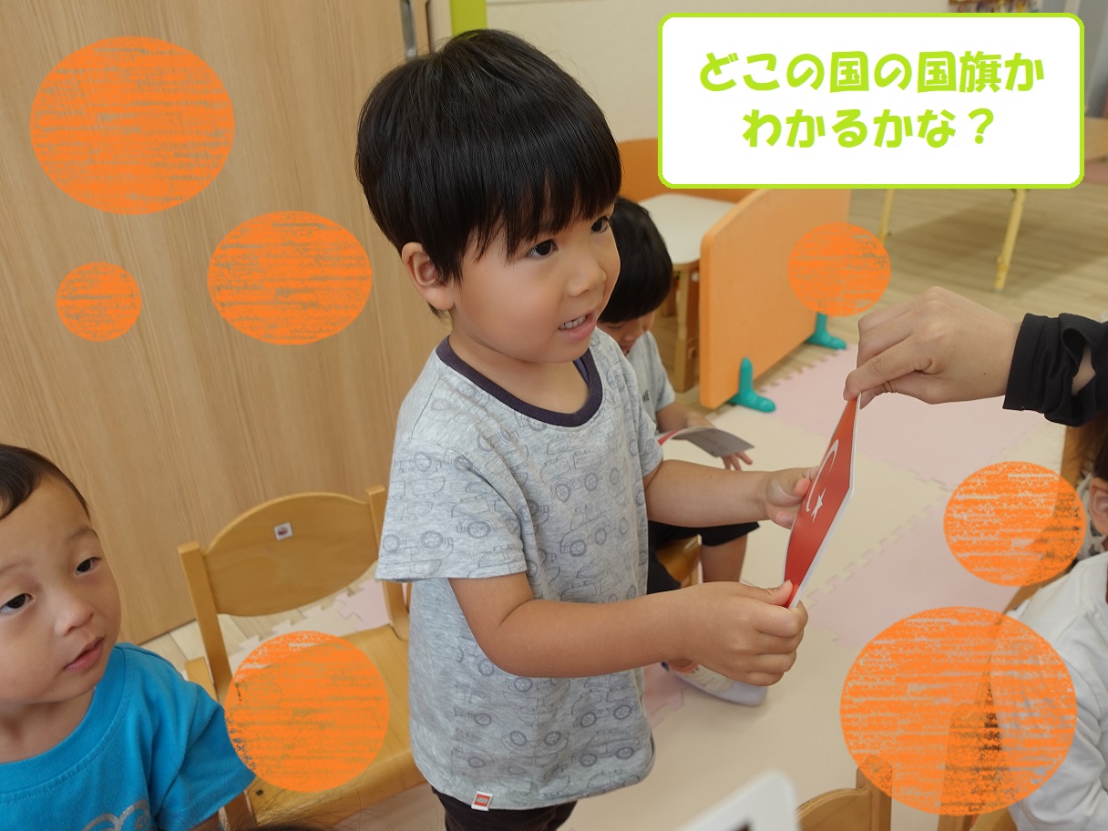 国旗では「このこっき、ほしがあるね!」「このこっき、びょういんみたい!」とカードを見ながら発見を楽しむ姿が見られます😊
