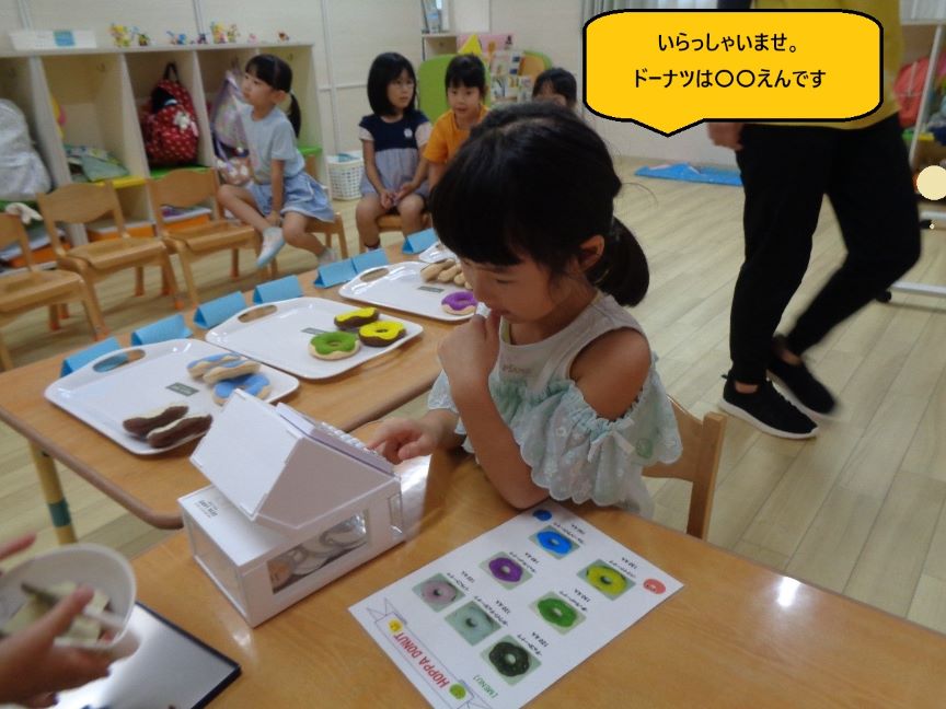 さらに、知育timeの中でドーナツ屋さんごっこを開催することで、「どれにしますか」「〇〇えんです」「おかえしは〇〇えんです」などとお金のやり取りを十分に楽しんでいるシリウス組さんです。