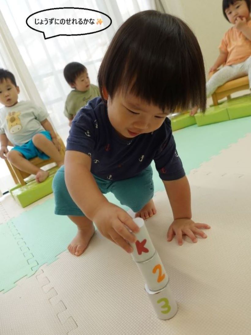 大好きな積み木に数字を貼ったものを使って保育者が言った数字を選んで積み上げています。