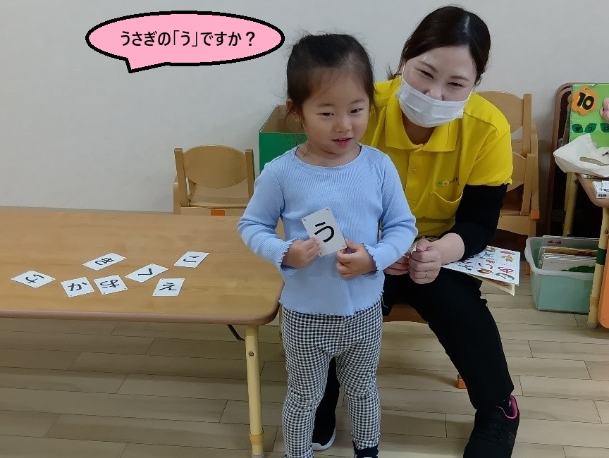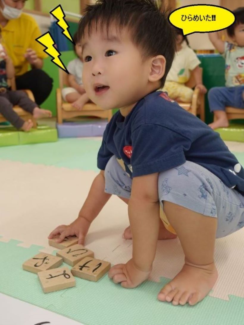 その後、少しずつ普段の生活の中でも自分の名前に入っているひらがなを見つけると「〇〇ちゃんの“あ”!!」とひらがな探しを楽しみ、少しずつひらがなを知ることや読めることの喜びを感じる姿が見られるようになっています♪