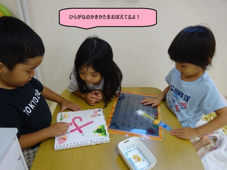 50音をカードを見ながら繰り返したり、『すなもじ』の絵本をなぞって正しい書き順を知ったり、様々な方法でひらがなに親しんでいます。