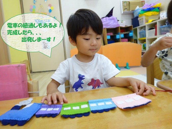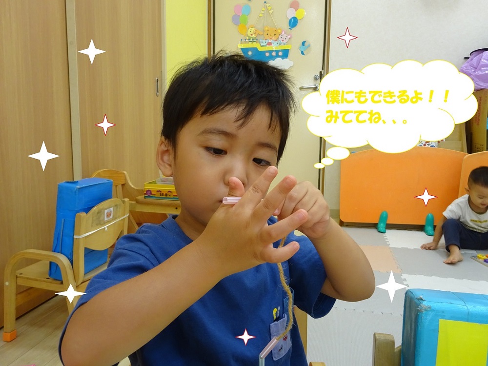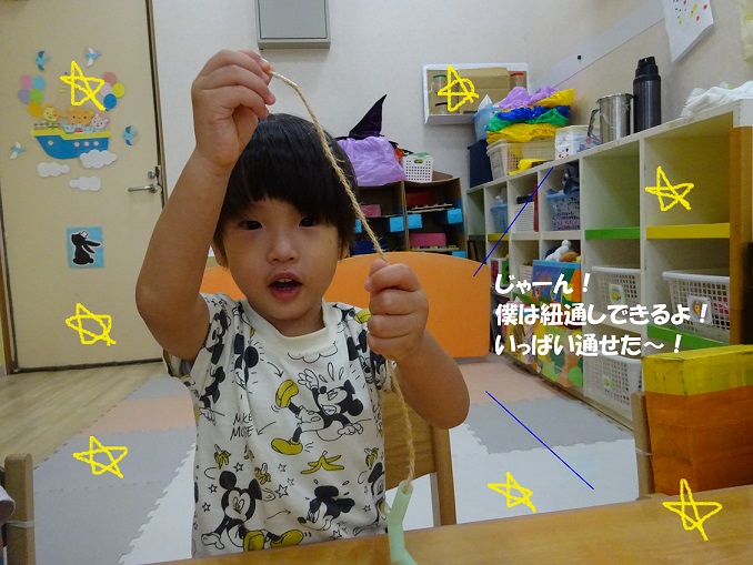 他にも紐通しやボタンはめなども指先を使った大好きな遊びです♪