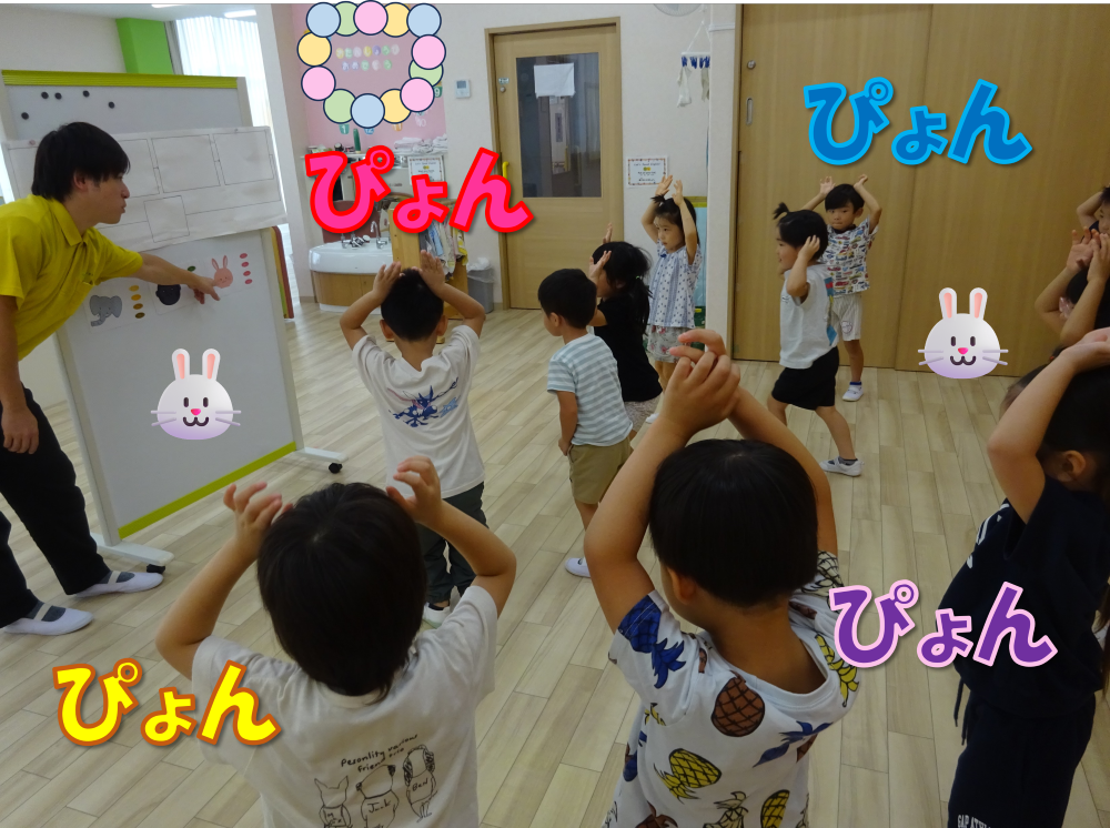 ウサギは「ぴょんぴょんぴょん」ゴリラは「ドンドンドン」など複数の動物の動きを覚えた後、保育士が指示するパターンに合わせて動物のダンスをしました。
