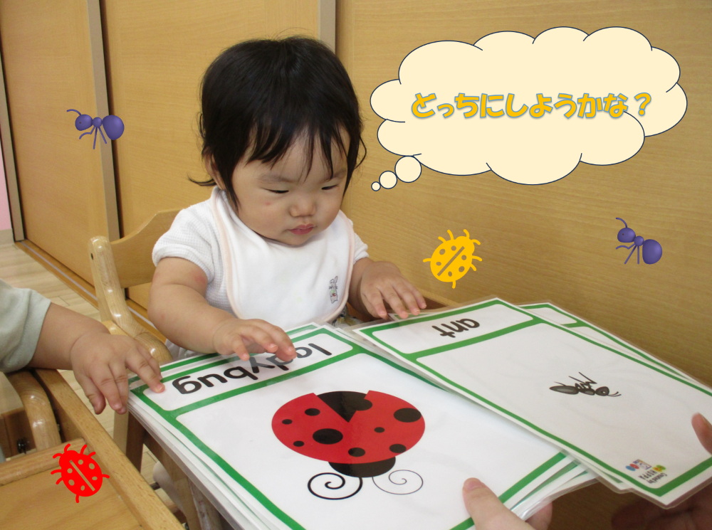 英語のカードにも興味津々で、「Which one do you like(どれが好き)?」と聞かれると、カードをタッチして答えています!