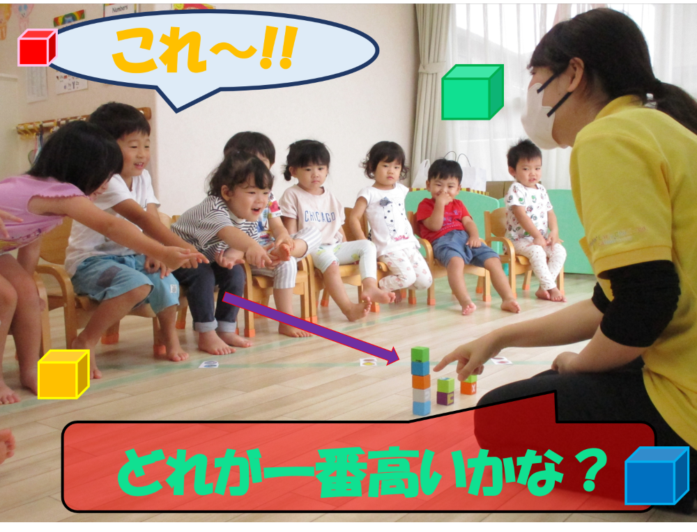 また、量では積み木を使い、積み上げて「どっちが高い?」「どっちが低い?」と質問すると、「2個は少ないから低いよ!」と自信満々で答えてくれます。