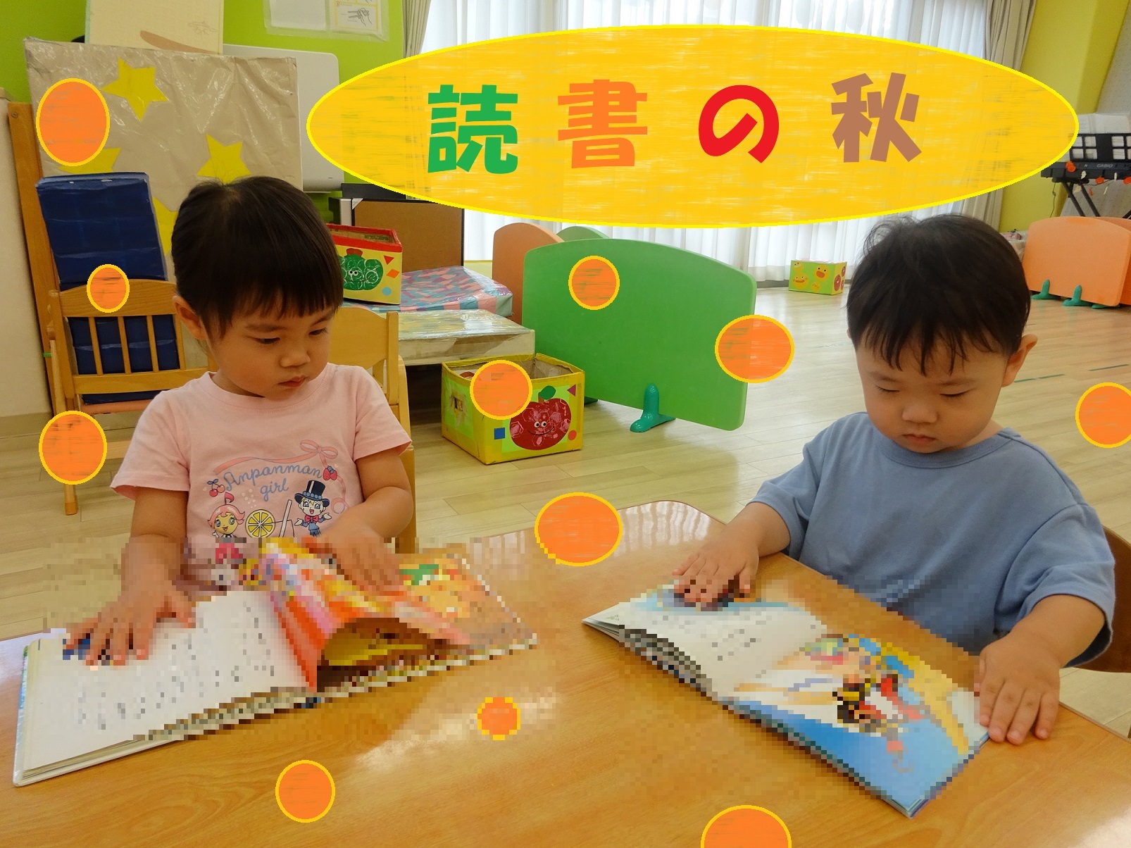 知育timeで「あいうえおの本」や「言葉カード」を見たり読んだりして、ひらがなも少しずつ覚えてきている子どもたち。