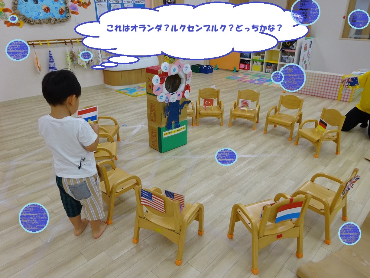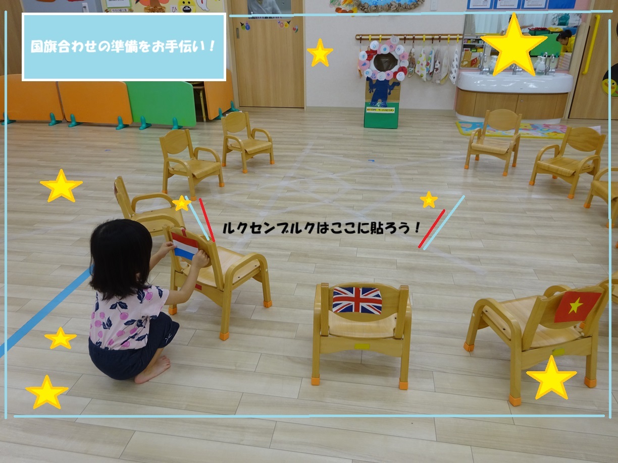 「これはオランダかな?ルクセンブルクかな?」と似ている国旗に戸惑いながらも自分の持っている国旗と照らし合わせたり、友だちと協力したりして、楽しみながら国旗合わせをしていました。