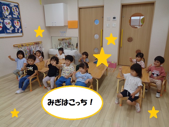 「右はどっちかな?」の質問に、「こっち~!」と手を挙げて元気いっぱい答えてくれる子どもたちです💕