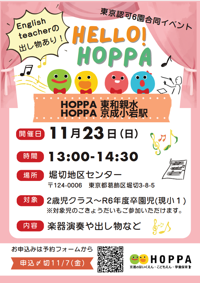 HOPPA東和親水(東京都足立区認可保育園)とHOPPA京成小岩駅(東京都葛飾区認可保育園)の合同イベントのお知らせです😊