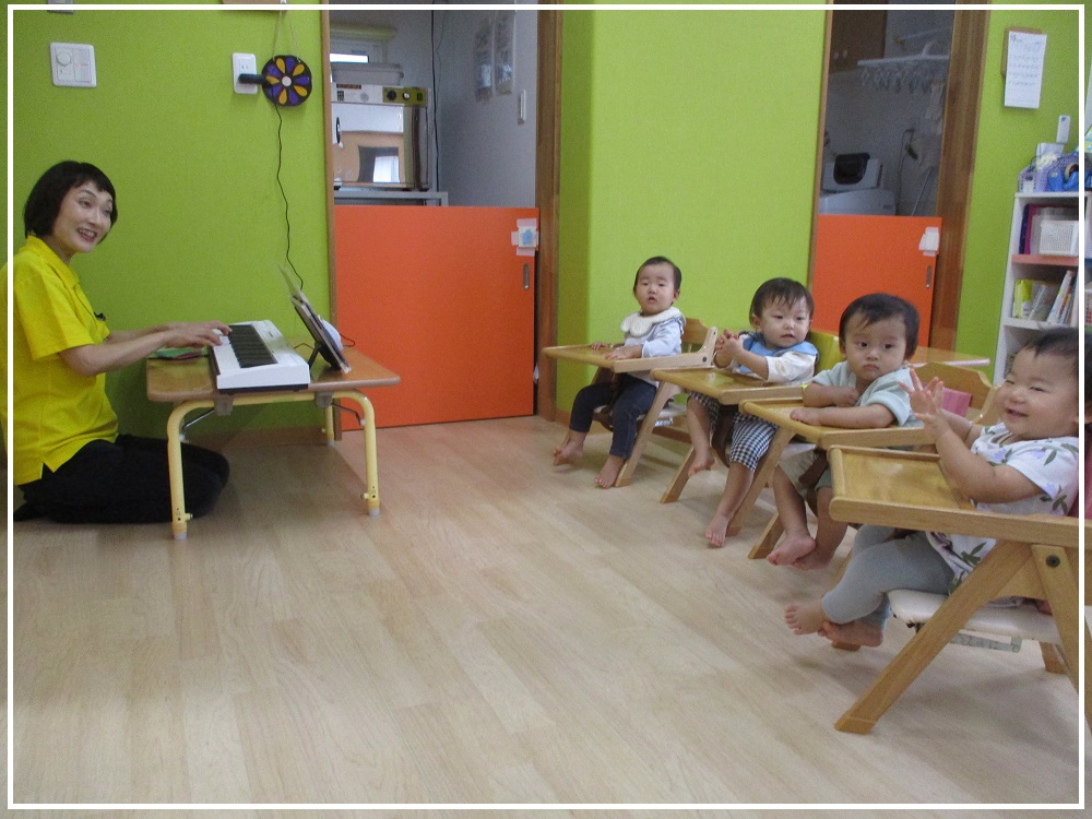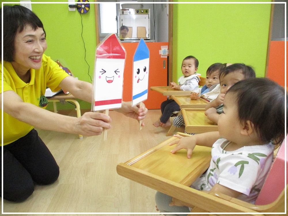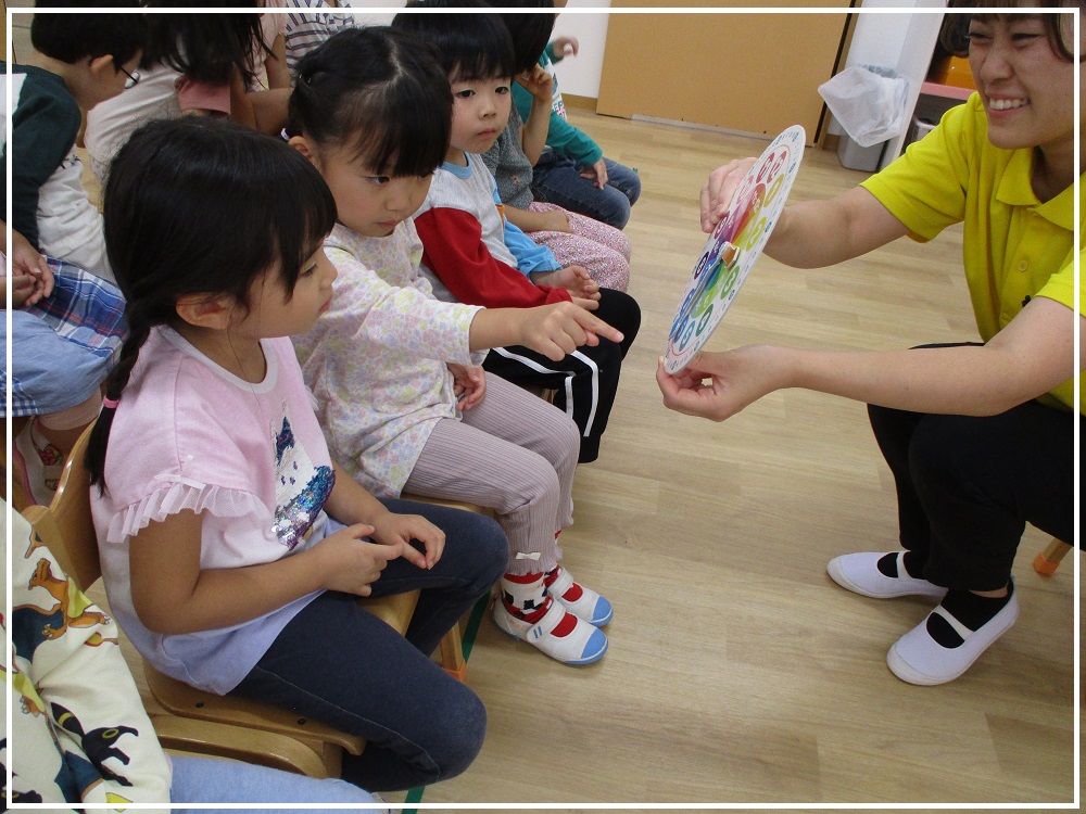 デネブ組(0歳児)のお部屋では、❝どんないろがすき❞とお歌を歌ったり、