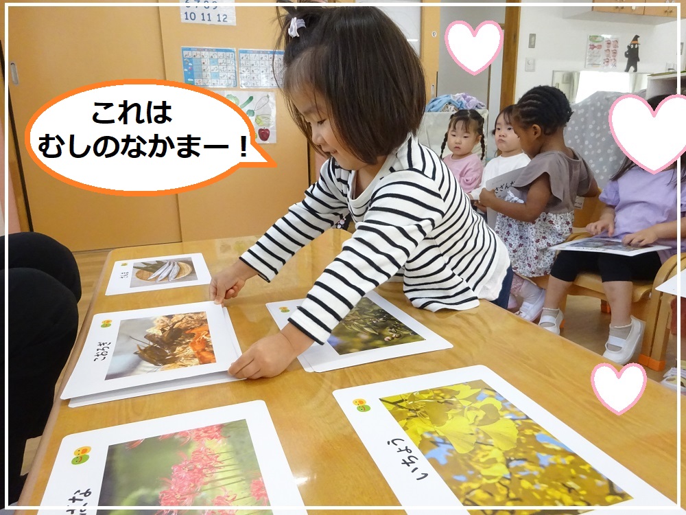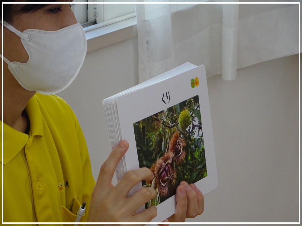 今日は❝言葉カード秋編❞の画像を見てそれが何であるかを1枚ずつめくりながら復唱し覚えていきます。