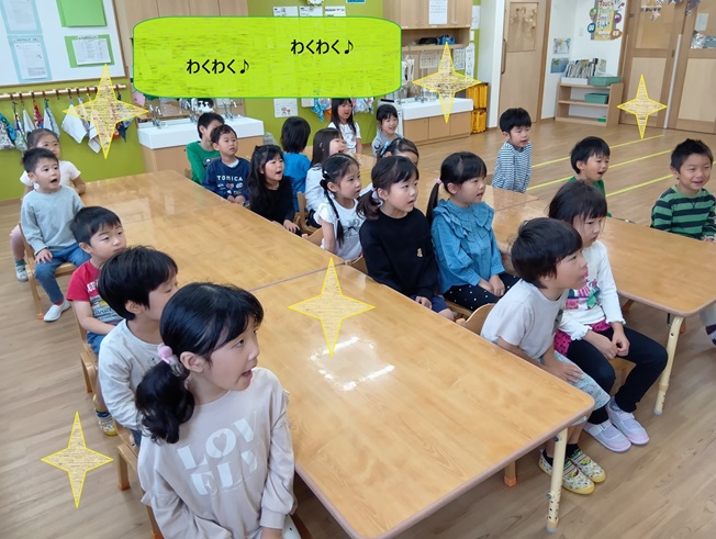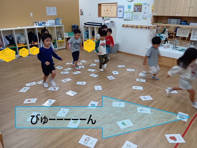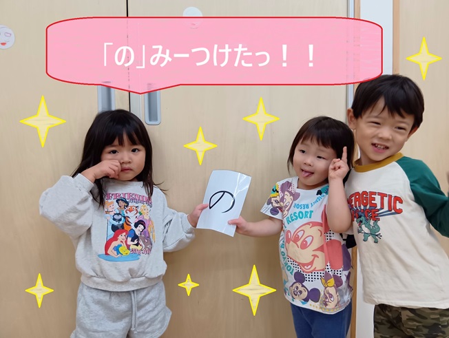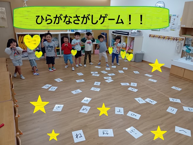 日頃の色々なところにひらがながあります。なんとなく形で覚えている子もいたのでひらがな探しゲームを行いました。