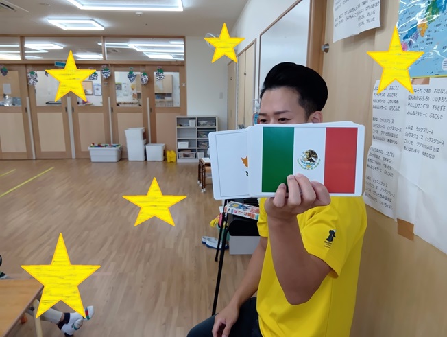 国旗カードを半分だけ見せて、何の国旗か当てるクイズを出します。