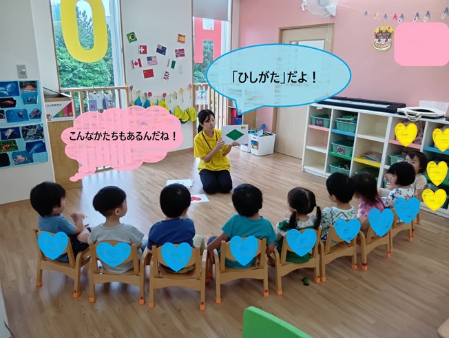 保育室の中に「ひしがたはどこに隠れているかな?」と教室の中を一緒に形探しをするのも楽しいですよ♪