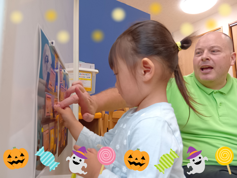 アーロン先生がハロウィンのイラストを見せると、おばけのイラストを見て怖がったり真似したりと様々な表情を見せながら参加しています。