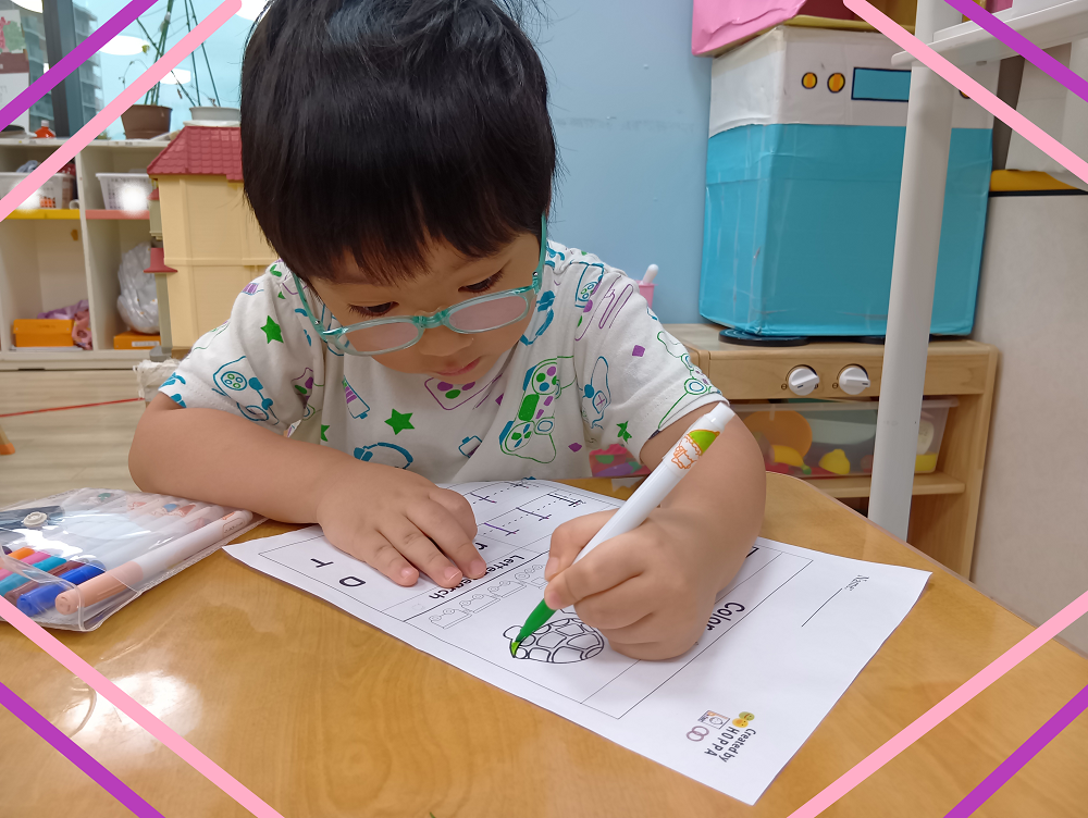 アルファベットが書けたら、その日のアルファベットから始まるイラストに色を塗ります。