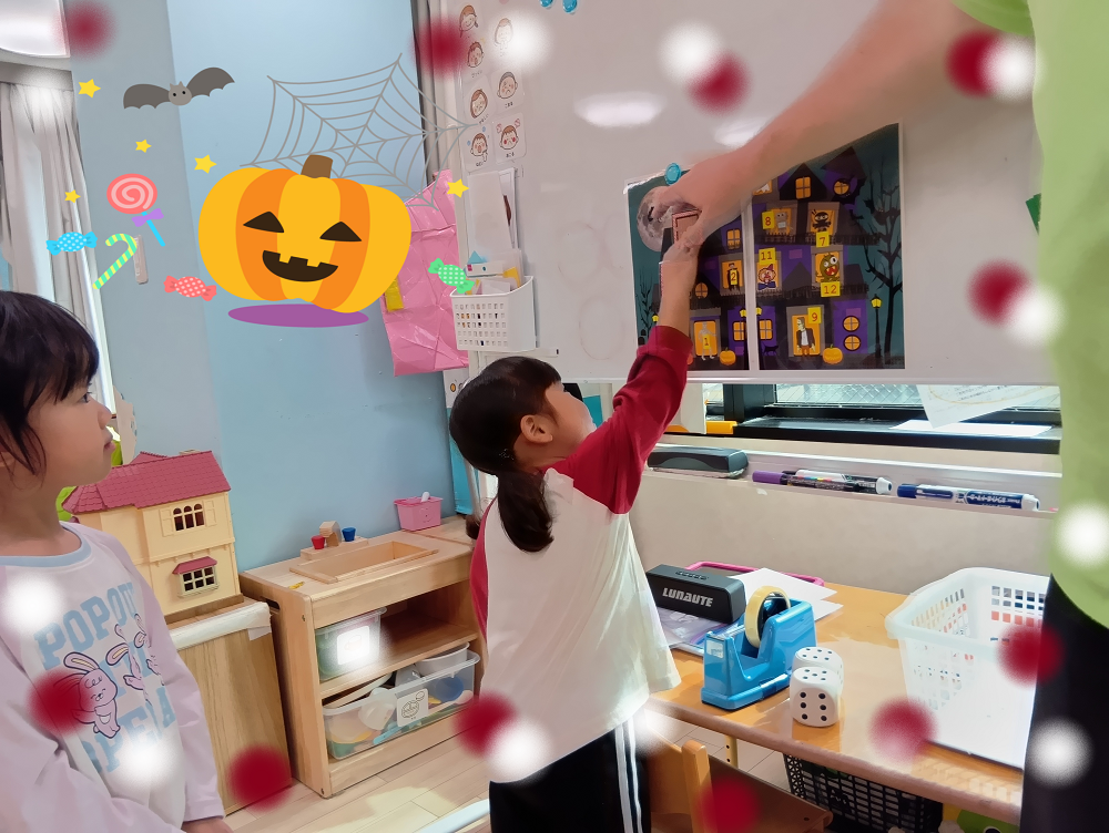 アーロン先生の英語を聞きながら、サイコロをしたりハロウィンのイラストにドアをつけたりとアーロン先生が考えてくれたゲームを楽しんでいる子どもたちです😊