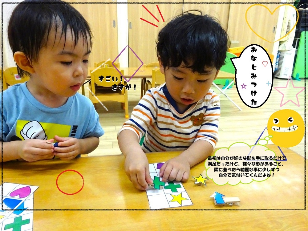 ベガ組さんは色や形のを覚えだして「ぼく(わたし)しってる!」と先生に伝えるのが嬉しくてたまりません。