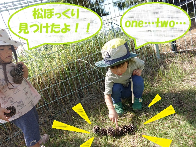 この自然探しの中には「見つける・掴む・拾う・入れる」「自然物に触れる」「ものの名前を知る」「横に並べる」「数える」などのたくさんの知育的要素が隠れていました。
