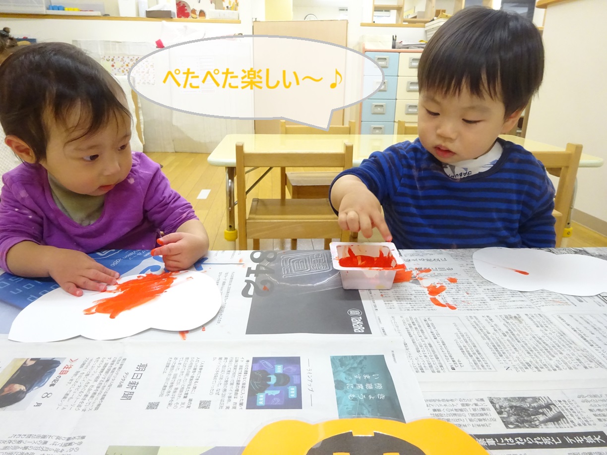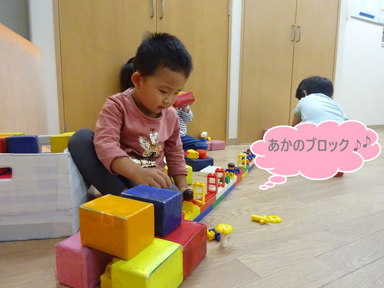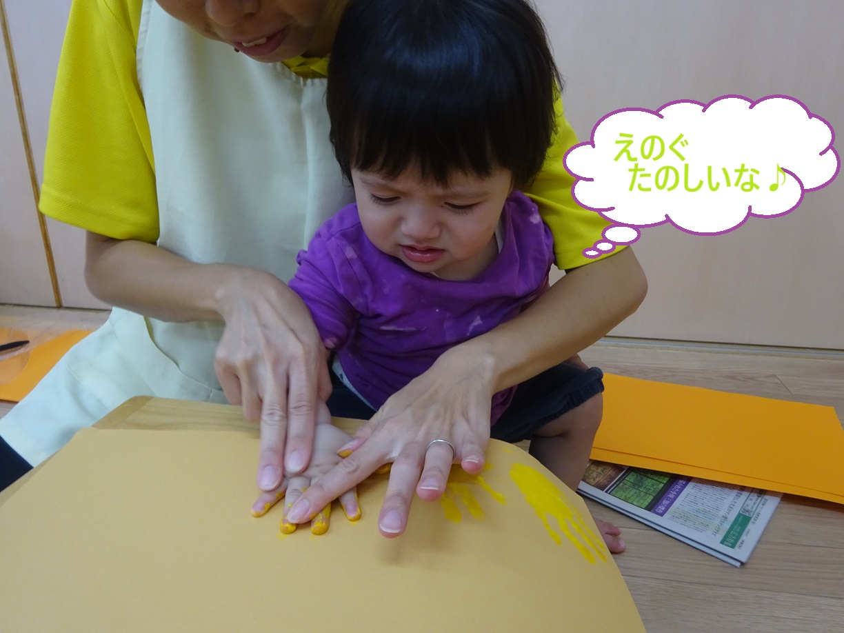 ブロックで遊びながら色を言ったり、絵の具に触れる製作にも意欲があり、「オレンジ色だね~」などと色を言いながら楽しんでいます。