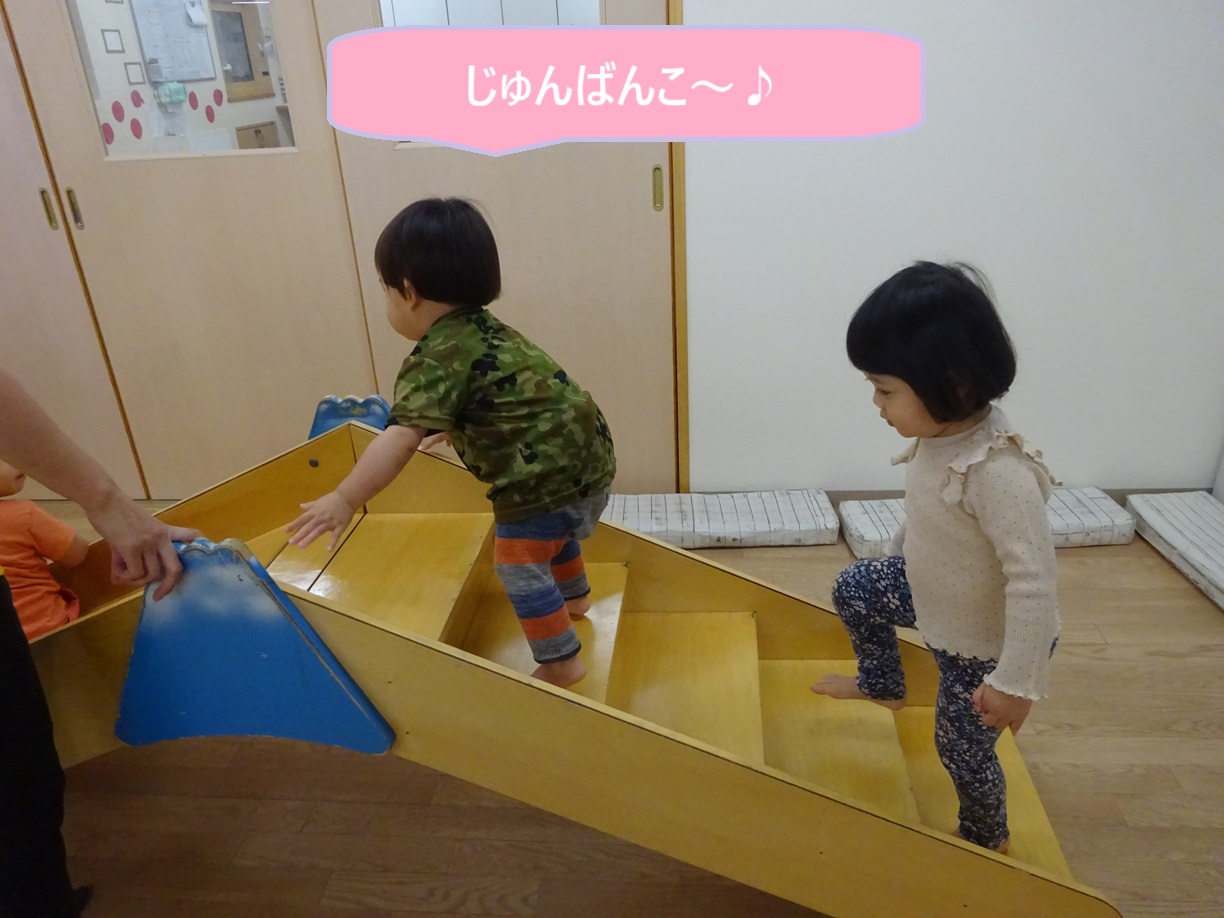 どうしても「わたしが先!」となりがちな月齢ですが、「前にお友だちがいるから順番だよ」「後ろでお友だちが待ってるから、先に進もうね」とお友だちの存在も伝えながら“自分の前後”が分かるようにお話しています。
