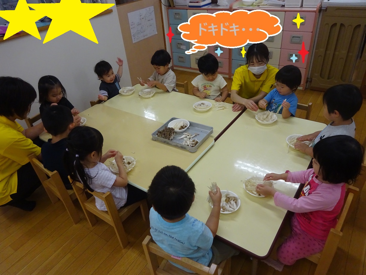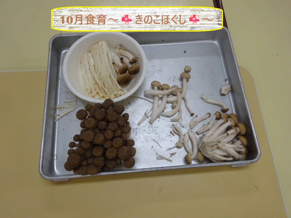 また秋の味覚にも触れ、食育で3種類のきのこをほぐしました🍄