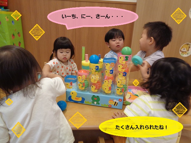 また自由遊びでは、先生手作りの1~10までの数を数えながら遊べるおもちゃの中にボールを入れたり、指先を使いながら穴に通したりしています☺