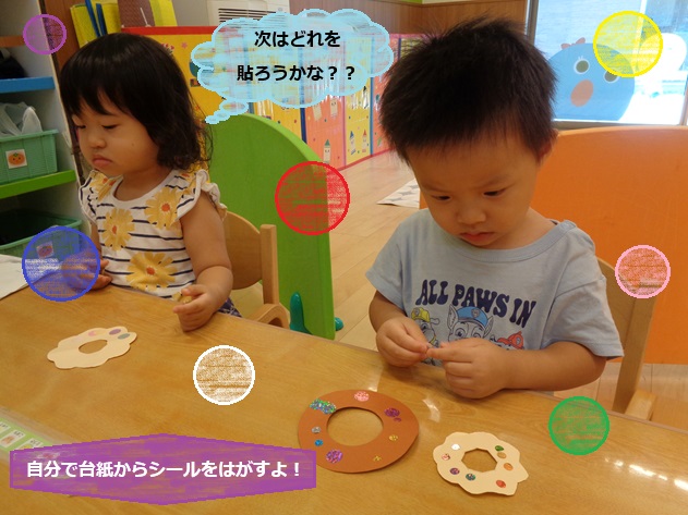 製作遊びでは、大小の違いがあるドーナツ🍩を使い、シールを貼ってどちらのドーナツが大きいかな?と考えて楽しんでいます🎵
