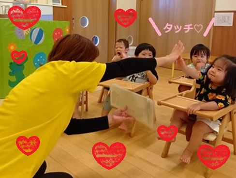 お名前呼びでは、自分のお名前が呼ばれると反応し、最近では手を挙げたり、先生とタッチしたりして喜んでいますよ✨