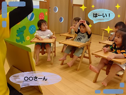 デネブ組の子どもたちは、イスに座って手遊びがはじまると〝何が始まるのかな?〟とワクワクした表情を見せてくれ、先生に視線が集まります☺