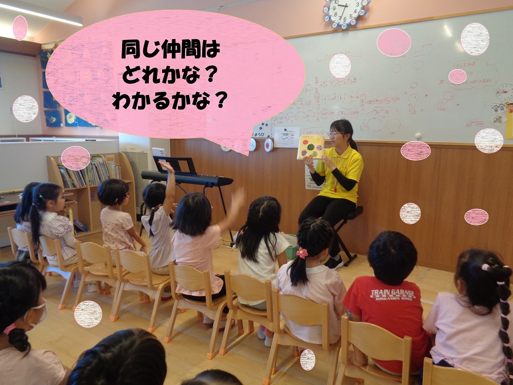 食べ物を見て、子どもたちが思う同じもの、違うものに分ける中で、ひとりのお友だちが「これとこれは中に種があるね」と言うと、次々に考え、答える姿が見られました✨