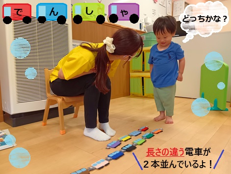 先生オリジナルの知育おもちゃを使い、連結させた2本の電車🚃を比べてどっちが長いかな?短いかな?と考えながら、クイズ形式で楽しく学んでいます✨