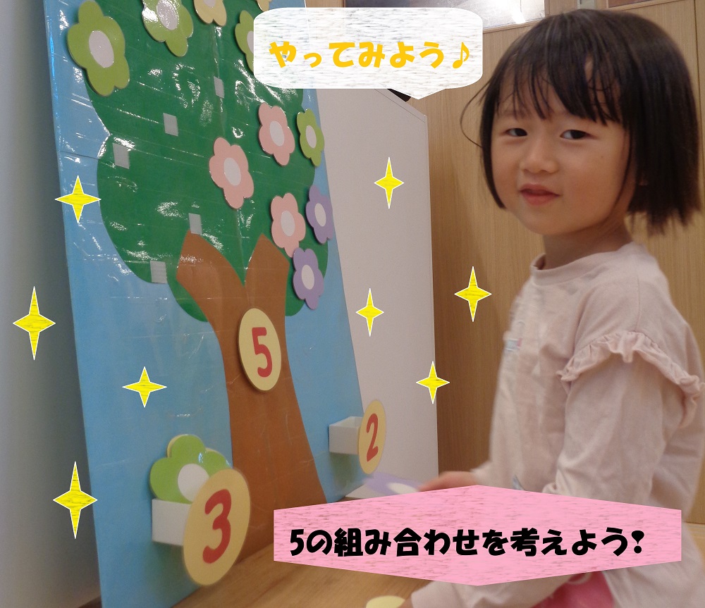 また自由遊びでは、先生手作りの1~10までの数を数えながら遊べるおもちゃの中にボールを入れたり、指先を使いながら穴に通したりしています☺