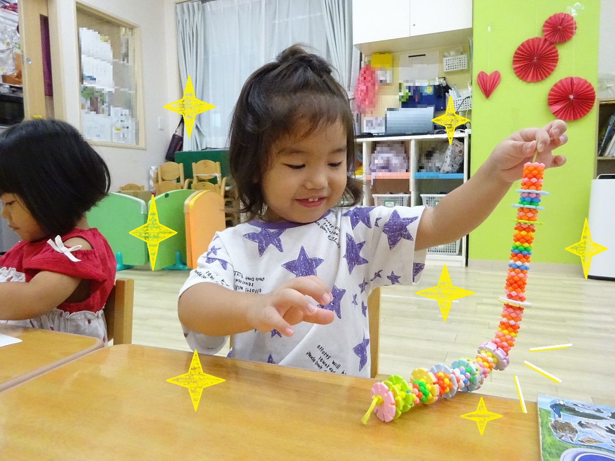 初めは座って見ているだけだった知育timeもシリウス組(2歳児)さんは今ではすっかりひらがなや数字を覚えている子が多く、戸外活動中や絵本の中にあるひらがなの拾い読みをするようになっています🌟