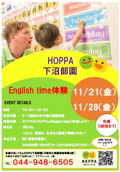 HOPPA下沼部園の園開体験イベント~English time体験~のお知らせです😊