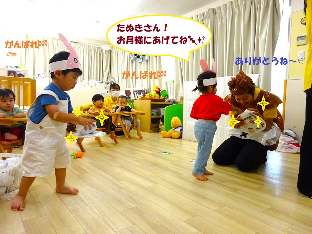 たぬきさんと一緒に秋の大運動会?をしながら、お団子をお月様にお供えしました。