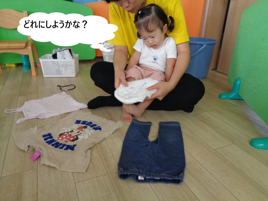 ズボン、シャツ、服、オムツを朝おやつや午睡前に自分で着脱しているんです。
