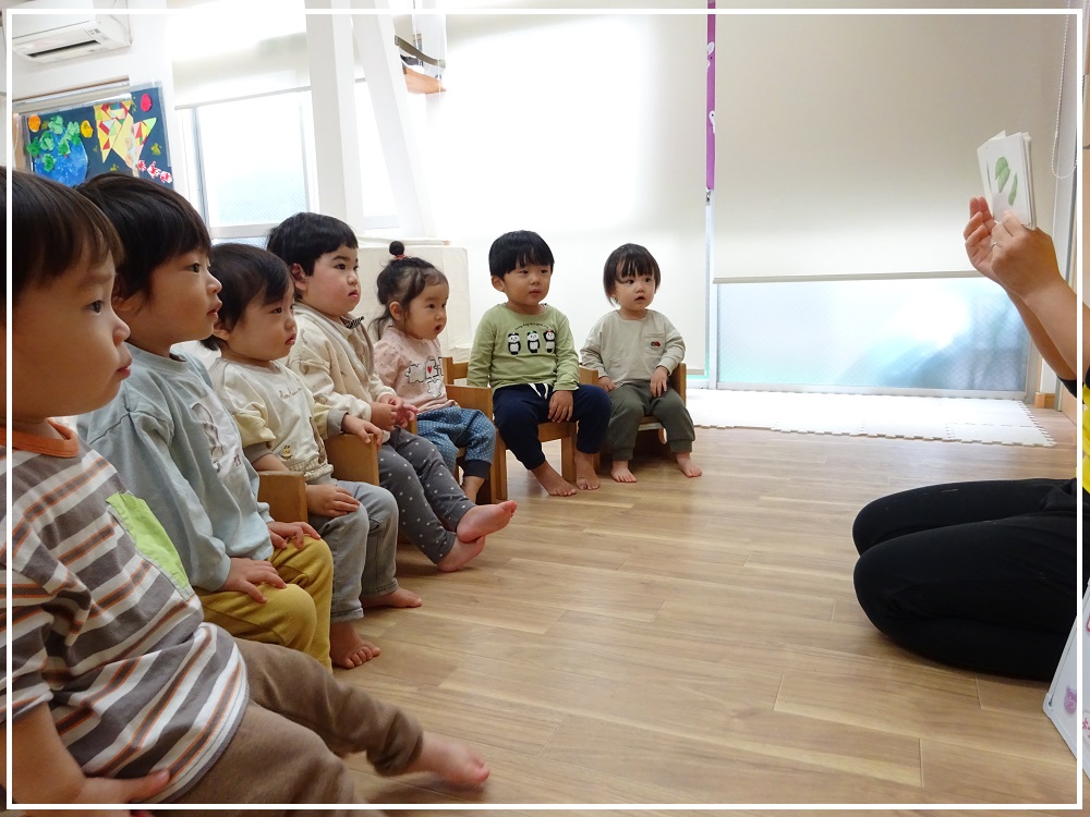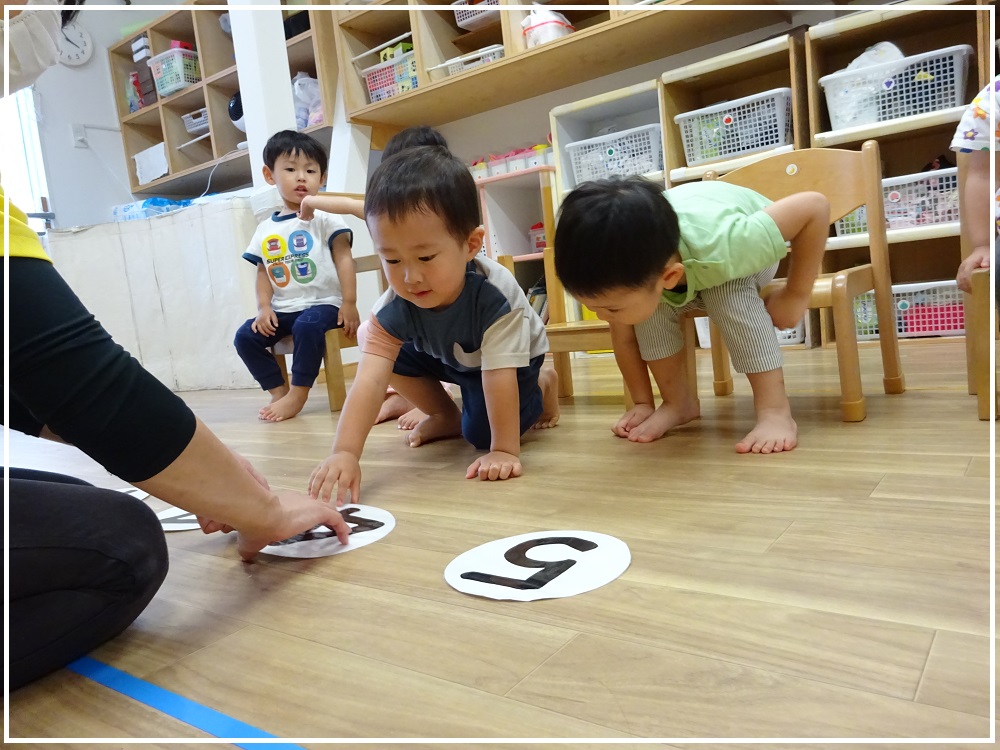 シリウス組(2歳児)では知育で、「すうじのうた」を元気いっぱい歌ったり、絵本に合わせて1から10までを数えたりしています。