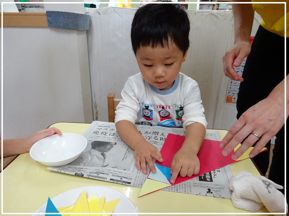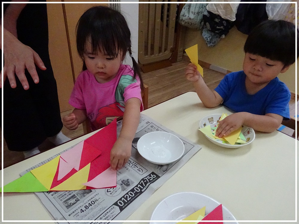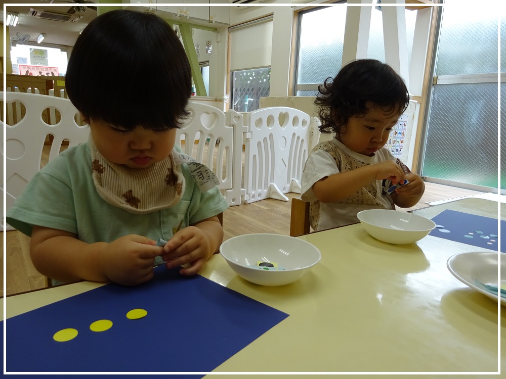 ベガ組(1歳児)の子どもたちは、シール貼りを楽しんでいます♪