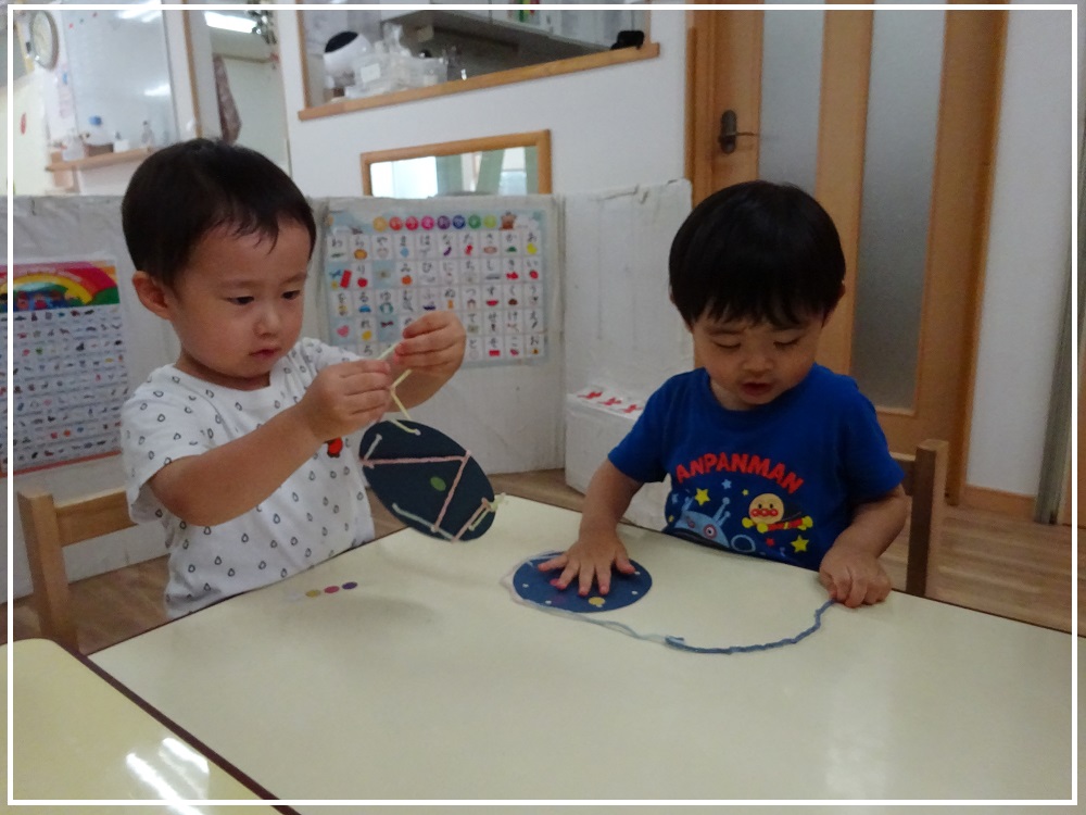 さんすう、こくごのみでなく巧緻性の領域では、紐通しをしながらきれいな惑星を作ろうという遊びをしました。