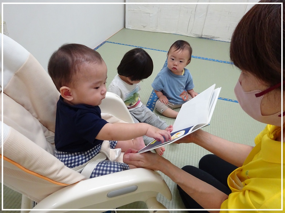 絵本を読み聞かせしていく中で様々な色や文字に興味を持ち、絵本に手を伸ばしたり追視をして楽しんでいます。