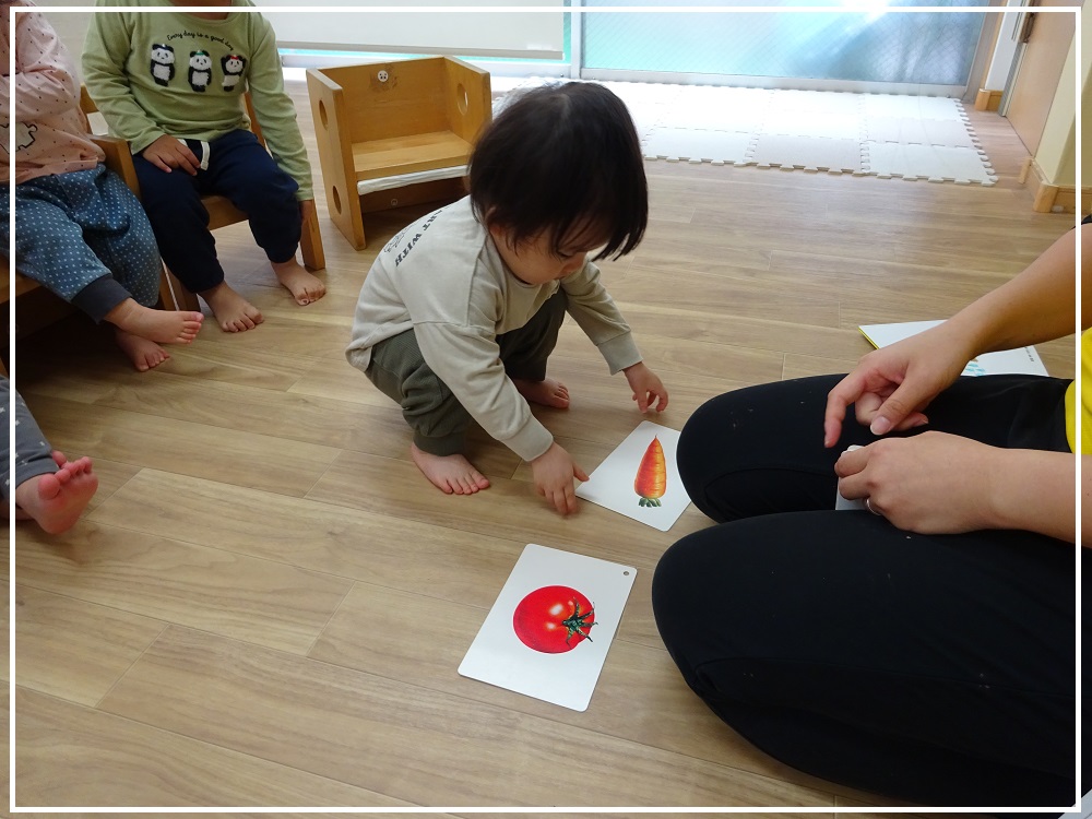 この日の知育は野菜カードを使いながら様々な野菜を見ていきました。
