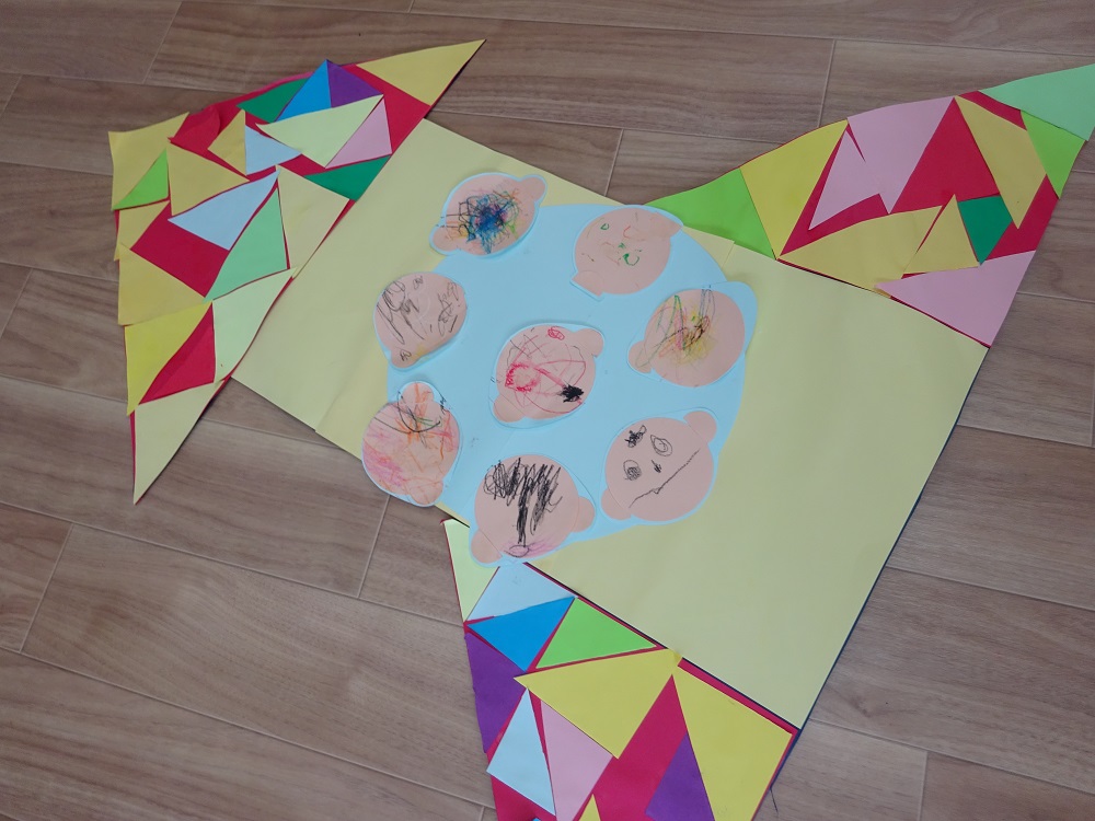 「みんなが乗れるロケットを作ろう」と大きな三角の中に様々な大きさの三角を組み合わせるというプログラミング的思考を取り入れながら素敵なロケットができあがりました🚀