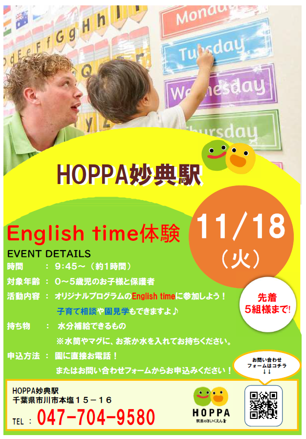 【千葉県市川市】園体験イベント開催のお知らせ~English time体験会~【HOPPA妙典駅】