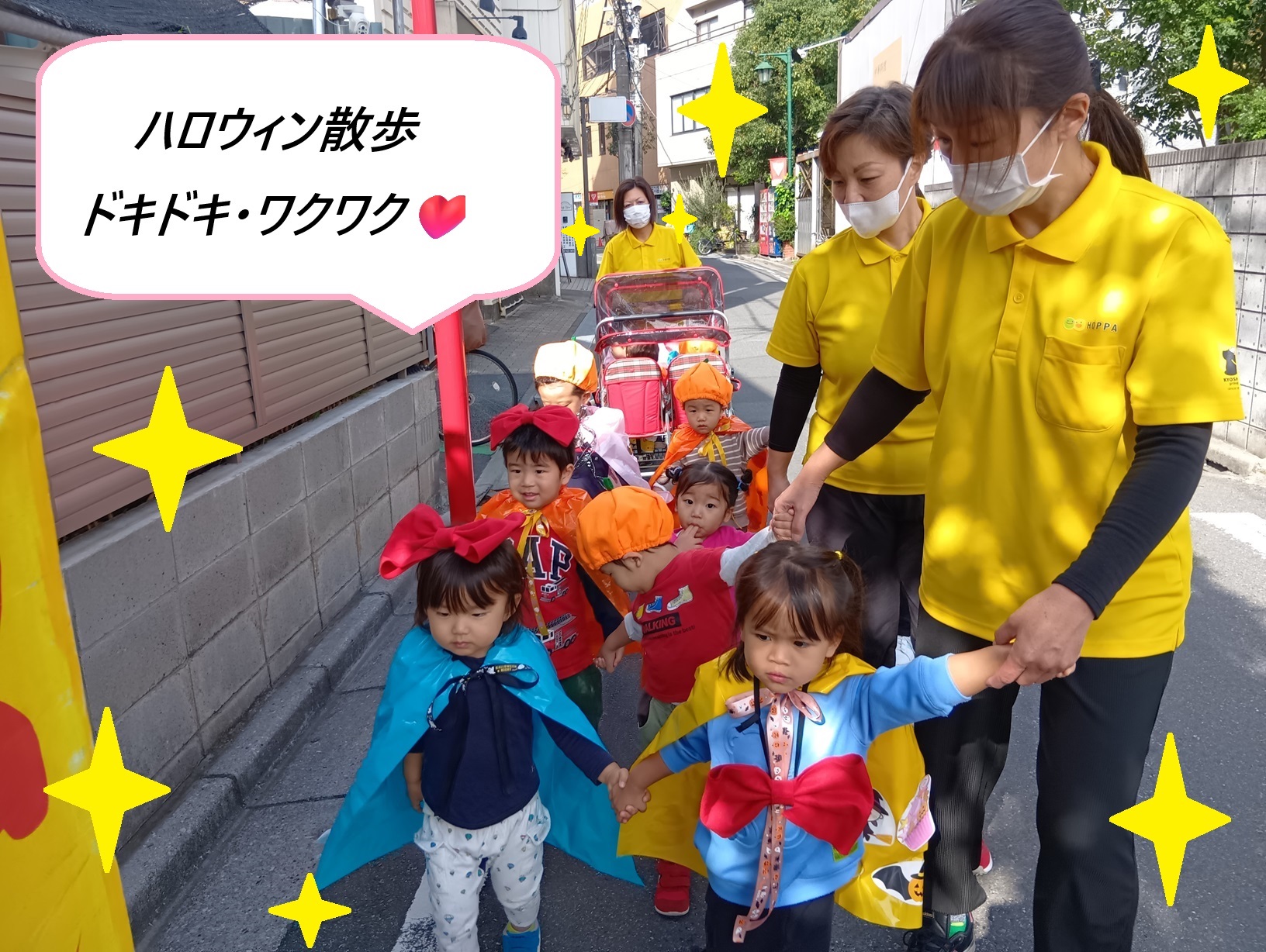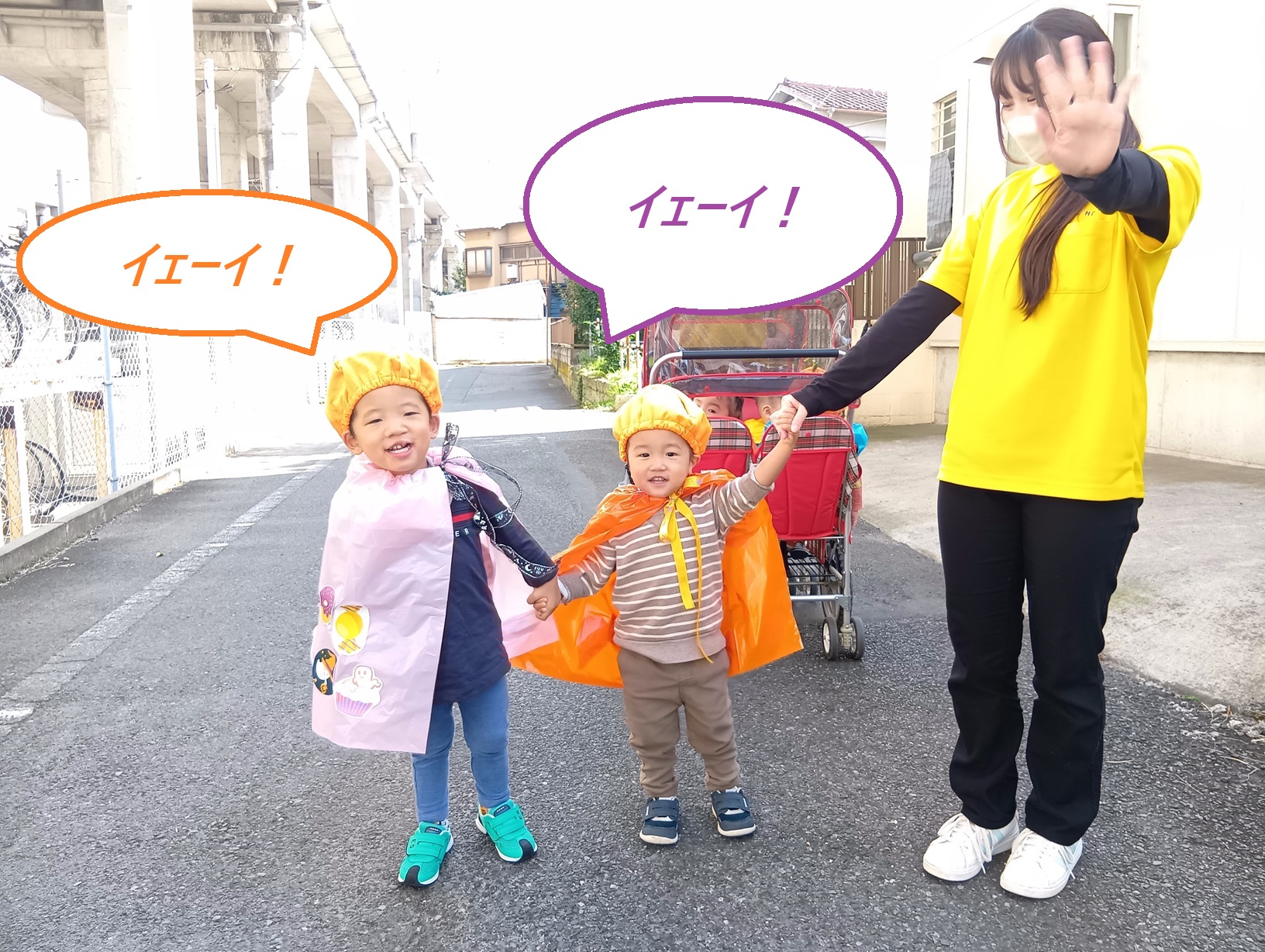 歩行者の方から「かわいいね!」「ハッピー ハロウィン♪」と声を掛けられ少し照れてしまうお友だちもいましたが自分から「みて~、ハロウィンなの!」とアピールする姿もあり楽しくお散歩ができました💖