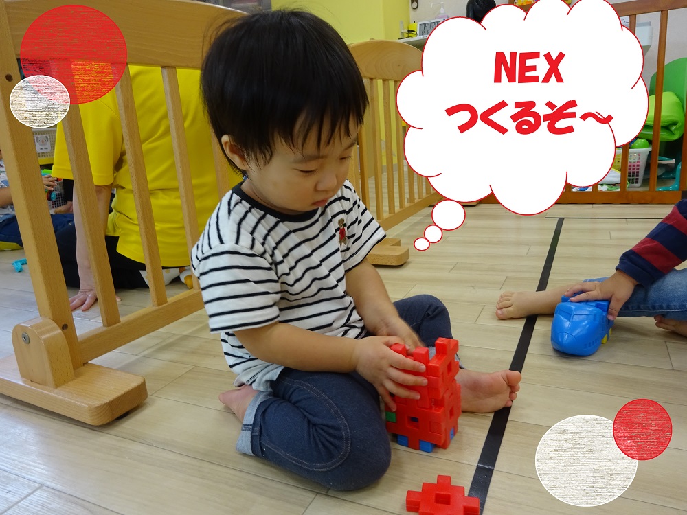 先生が「何色でつくろうか?」と質問してみると「赤!」と答えながら赤いブロックを集めて作り上げて楽しんでいます。